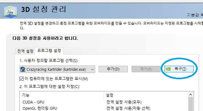 해당 3D설정을 프로그램 사용하시는 동안만이라도 원본으로 복귀시켜주세요